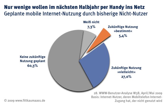 Die Wahrscheinlichkeit, dass der Kreis der aktiven Nutzer des mobilen Internet in naher Zukunft nennenswert wächst, ist nach den W3B-Ergebnissen gering. Die Besitzer internetfähiger Mobiltelefone, die bislang noch nicht via Handy ins Netz gegangen sind, wurden von W3B nach ihren Zukunftsplänen gefragt. Dabei stellte sich heraus, dass nur ein sehr kleiner Anteil der aktuellen Nicht-Nutzer