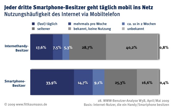 Unbeeindruckt von den wahrgenommenen Hürden bei der mobilen Internet-Nutzung zeigen sich die Besitzer von Smartphones. Diese modernen, mit Computerfunktionen und Touchscreen ausgestatteten Mobiltelefone (wie z.B. Blackberry, iPhone) sind meist im Besitz gutverdienender Internet-Nutzer, die in leitenden Positionen tätig sind. Für sie stellen zum einen die Kosten kein Problem dar, zum anderen ist die Bedienerfreundlichkeit der Smartphones den durchschnittlichen Internet-Handys weit überlegen. Die Konsequenz: Während unter den Besitzern »normaler« Internet-Handys nicht einmal jeder Fünfte täglich mobil ins Internet geht, tut dies unter den Smartphone-Eigentümern jeder Dritte!