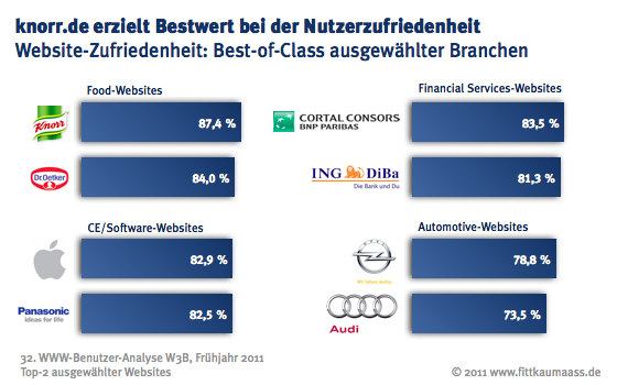 Über 50 deutsche Websites verschiedener Branchen werden im Rahmen der W3B-Benchmarking-Reports aus der Nutzerperspektive untersucht. Als führend in punkto Nutzerzufriedenheit wurden dabei die Food-Website knorr.de und die Beauty-Website nivea.de mit jeweils 87 % zufriedenen Besuchern identifiziert. Auf Platz drei folgt der Onlineauftritt von Dr.Oetker (oetker.de) mit 84 %.
