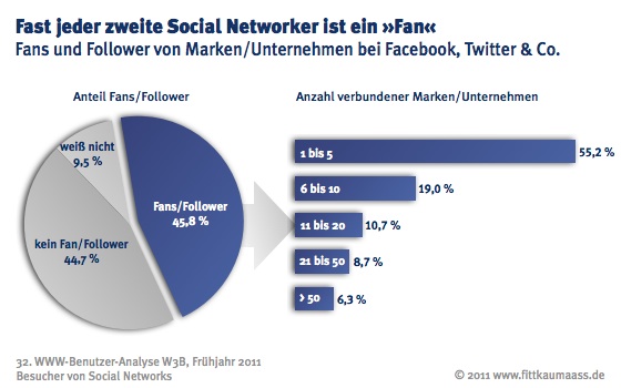 Die meisten Fans und Follower (55 %) sind bis dato jedoch mit maximal einer Handvoll Marken bzw. Unternehmen verbunden. Nur wenige (15 %) sind auf Social Network-Websites und/oder Twitter bei mehr als 20 Marken oder Firmen Fan, Follower oder Freund. Den Ergebnissen des W3B-Report zufolge weisen diese Personen gegenüber dem durchschnittlichen Social Networker keine demographischen Besonderheiten auf. Die Fans fallen jedoch durch ihre insgesamt sehr aktive Online-Nutzung auf - im Social Web und vor allem auch im Bereich Online-Shopping.