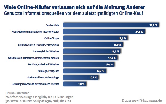 Fittkau & Maaß Consulting ging diesen Fragen nach und befragte im Rahmen der W3B-Studie deutschsprachige Internet-Nutzer zu ihrem letzten Online-Einkauf. Die Ergebnisse, veröffentlicht im W3B-Report »Kaufentscheidung im Internet«, sind deutlich: Sie belegen die enorme Bedeutung von Meinungen, Bewertungen und Empfehlungen anderer Personen für die eigene Kaufentscheidung.