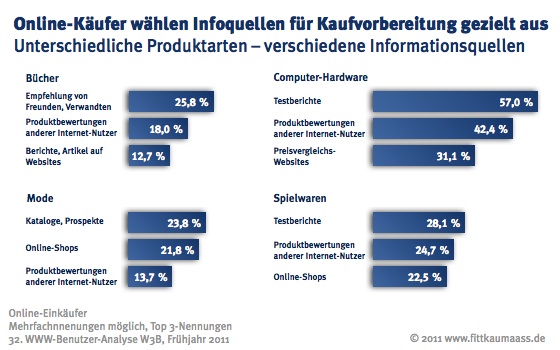 Bei Online-Modekäufen kann der gedruckte Katalog durchaus noch mit dem Webshop mithalten; auch Meinungen anderer Online-Nutzer finden oft Beachtung. Vor dem Buchkauf via Internet wird der größte Wert auf Empfehlungen Anderer gelegt. Dabei fließen Meinungen von Bekannten und Freunden häufiger in Kaufentscheidungen ein als die von anderen (unbekannten) Internet-Nutzern.