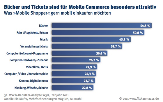 Kleidung und Mode hingegen wird im mobilen Internet vergleichsweise selten nachgefragt. Nur 23 % der befragten Besitzer internetfähiger Handys, Smartphones oder Tablet PCs möchten diese Produkte über ihr mobiles Endgerät erwerben.