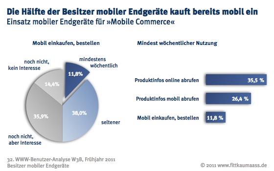 Während unter den Besitzern von internetfähigen Mobiltelefonen 7 % mindestens einmal pro Woche etwas mobil einkaufen, sind es unter den Smartphone-Besitzern doppelt so viele, nämlich 14 %. Unter den Eigentümern von Tablet PCs gibt sogar fast ein Drittel an, wöchentlich im mobilen Web einzukaufen. iPads und andere Tablet PCs schaffen somit den Brückenschlag zwischen klassischem und mobilem Internet und bieten somit das Potential, dem Mobile Commerce zum Durchbruch zu verhelfen.